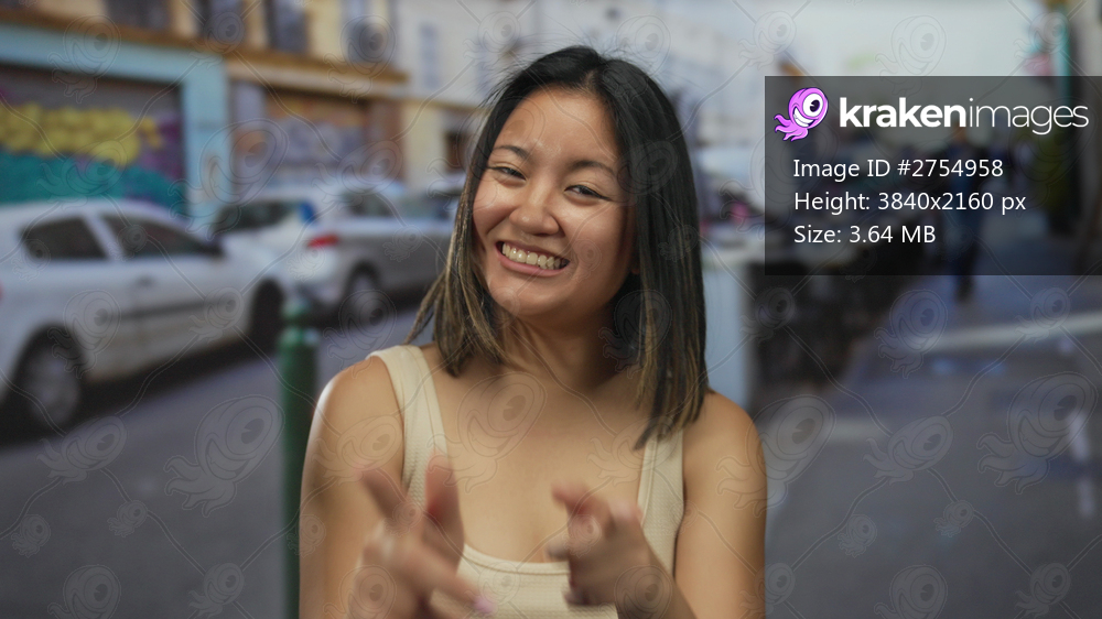 Young woman pointing playfully in urban street setting with blurred background of city and parked cars, exuding happiness and confidence in a casual outdoor atmosphere. - Kraken Images