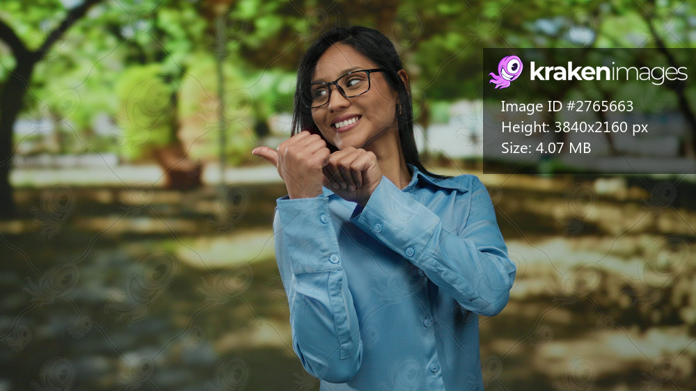 Young woman pointing thumbs back in a vibrant green park setting, wearing glasses and blue shirt, expressing positivity and confidence during a sunny outdoor day. - Kraken Images