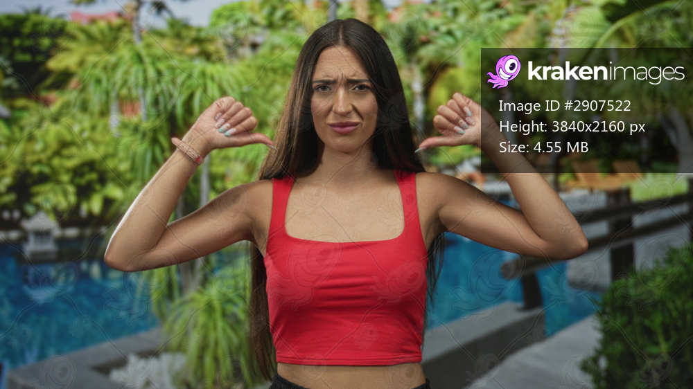Young woman pointing thumbs to chest at resort pool with frown and furrowed brows; disapproval refusal.