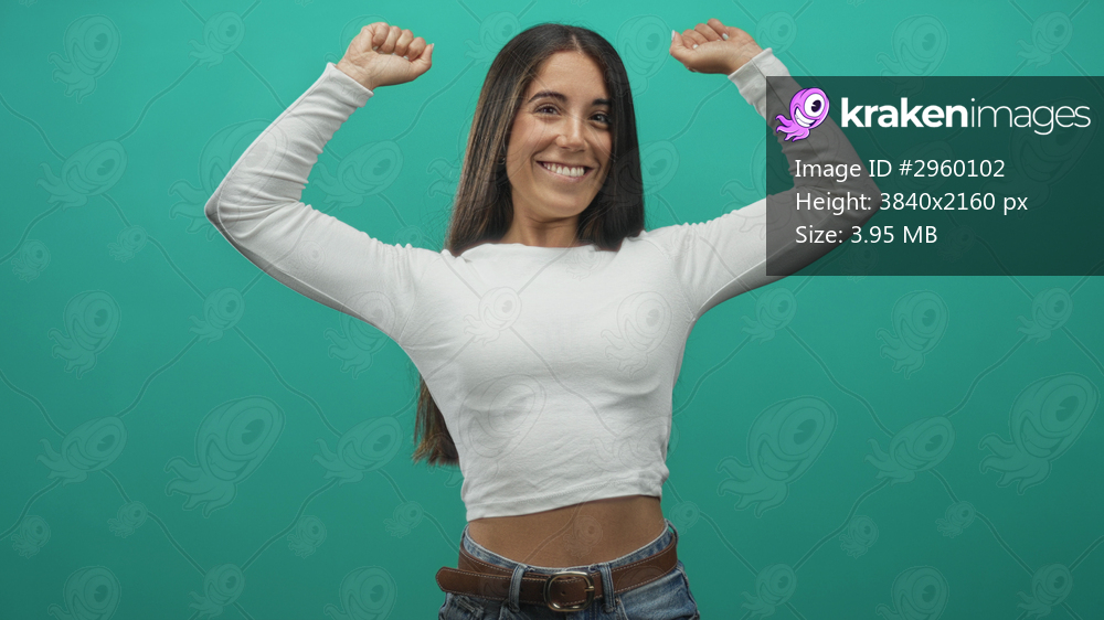 Young woman pointing thumbs to herself showing a big smile and exposed midriff in studio; confidence empowerment.