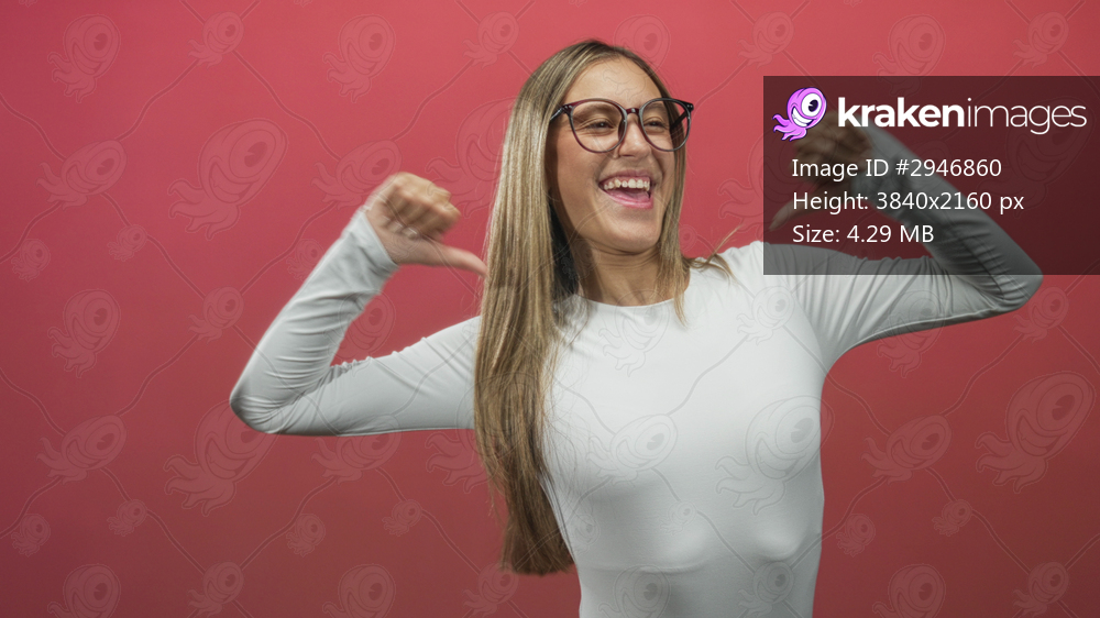Young woman pointing thumbs toward her chest in a studio with pink backdrop; confidence celebration.