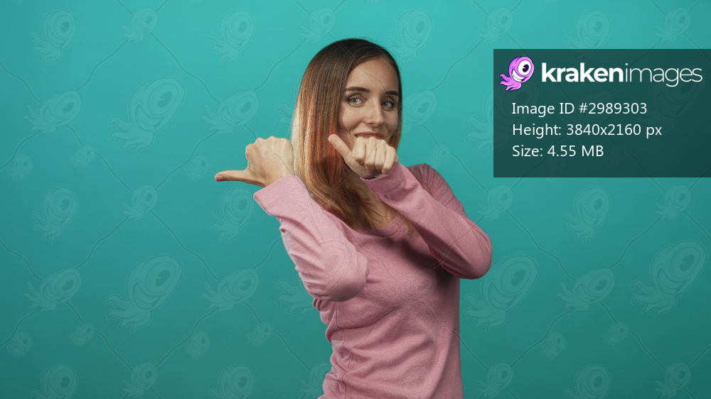 Young woman pointing thumbs toward her shoulder in studio with teal wall and pink sweater; playful confidence.