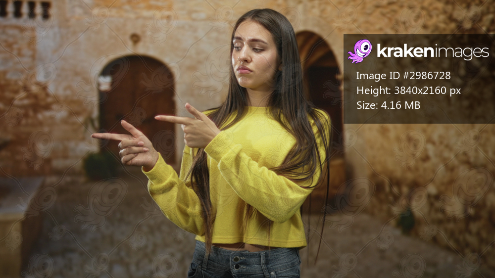 Young woman points both index fingers with visible hands toward a stone building entrance, wearing yellow sweater and jeans; hesitation doubt.