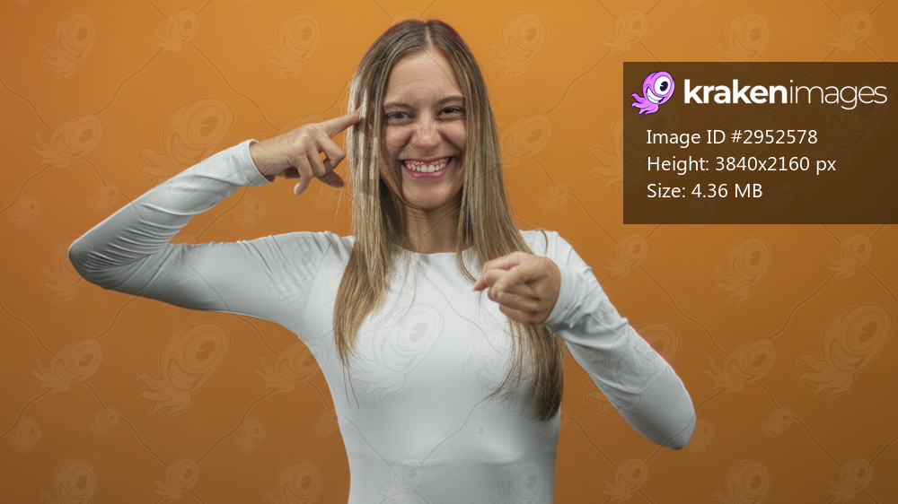 Young woman points finger at camera in studio against orange backdrop; playful teasing boldness attitude.
