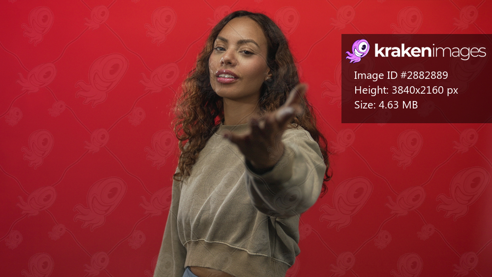 Young woman points finger at camera in studio against vivid red backdrop; confidence empowerment outreach.