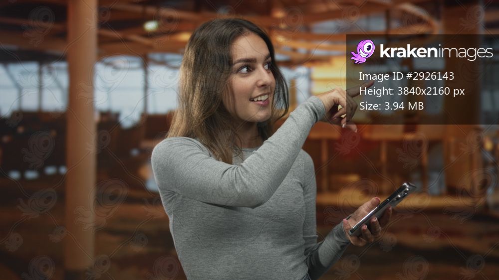 Young woman points finger at smartphone while holding device in a busy building lounge, smiling and looking right; joy discovery.