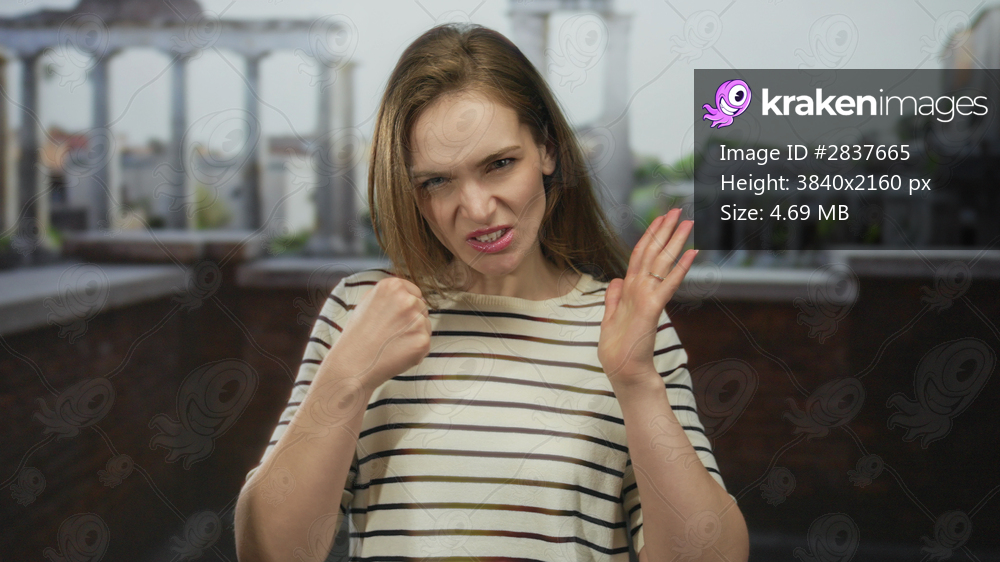 Young woman points finger directly at camera in ancient roman building; anger tension defiance frustration.