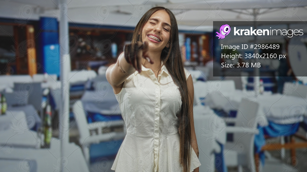 Young woman points finger forward at camera amid outdoor cafe tables on a street, braces visible and long hair draped over shoulder; playful invitation. - Kraken Images