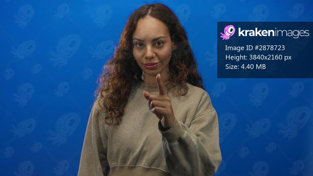 Young woman points finger in blue studio wearing neutral sweatshirt with curly hair blowing across shoulders; confidence focus.