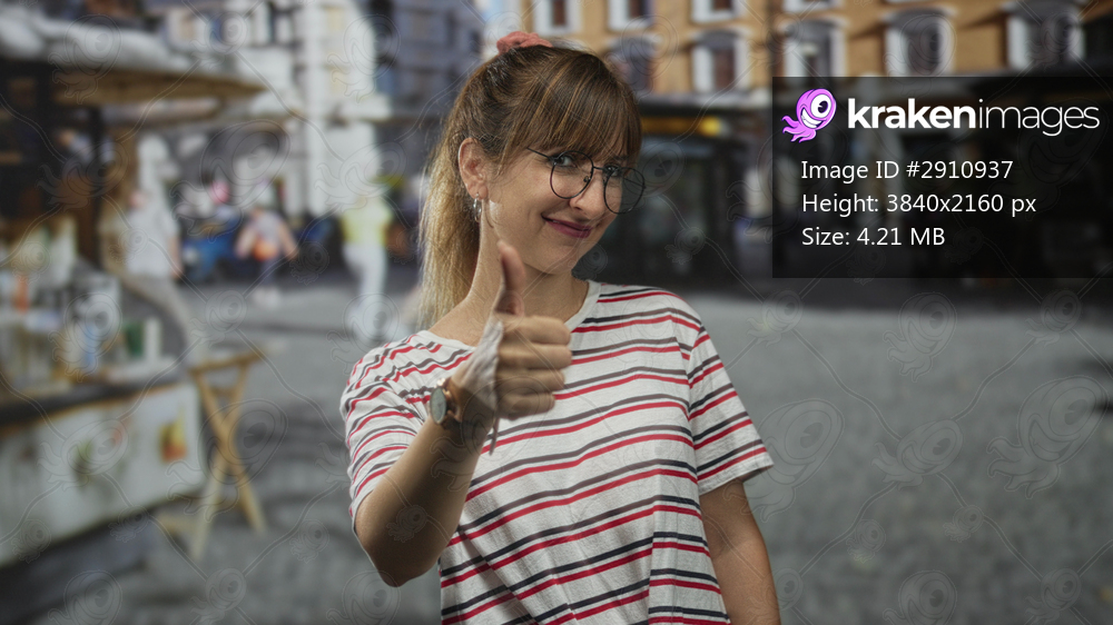 Young woman points finger in city street showing hand gesture and striped tee with watch; playful invitation.