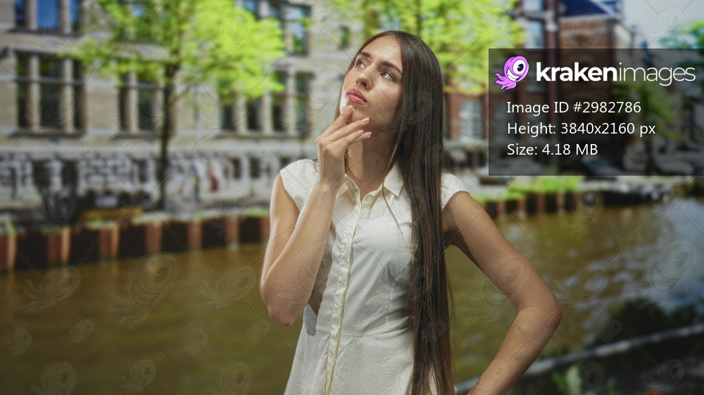 Young woman points finger near face beside canal building in city wearing white dress and long hair; contemplation.