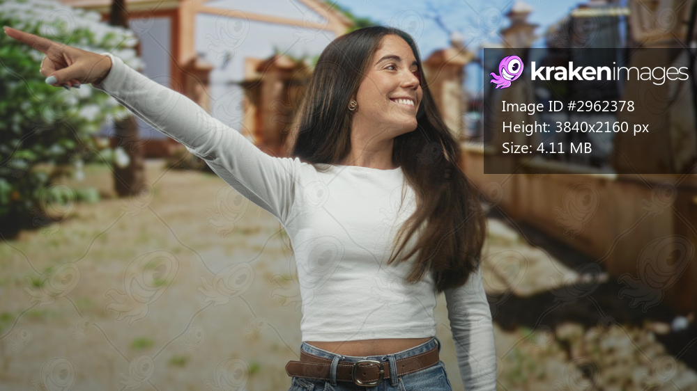 Young woman points finger with outstretched arm on a sunny residential street, smiling in jeans and belt; joyful optimism.