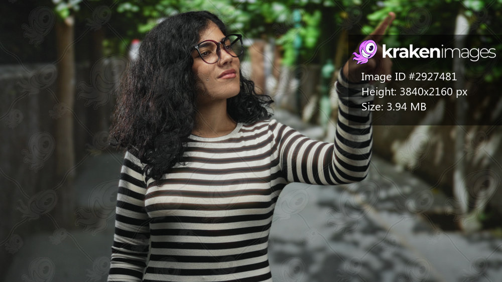 Young woman points finger with raised hand on a narrow city street lined with trees and stone walls; curiosity discovery.