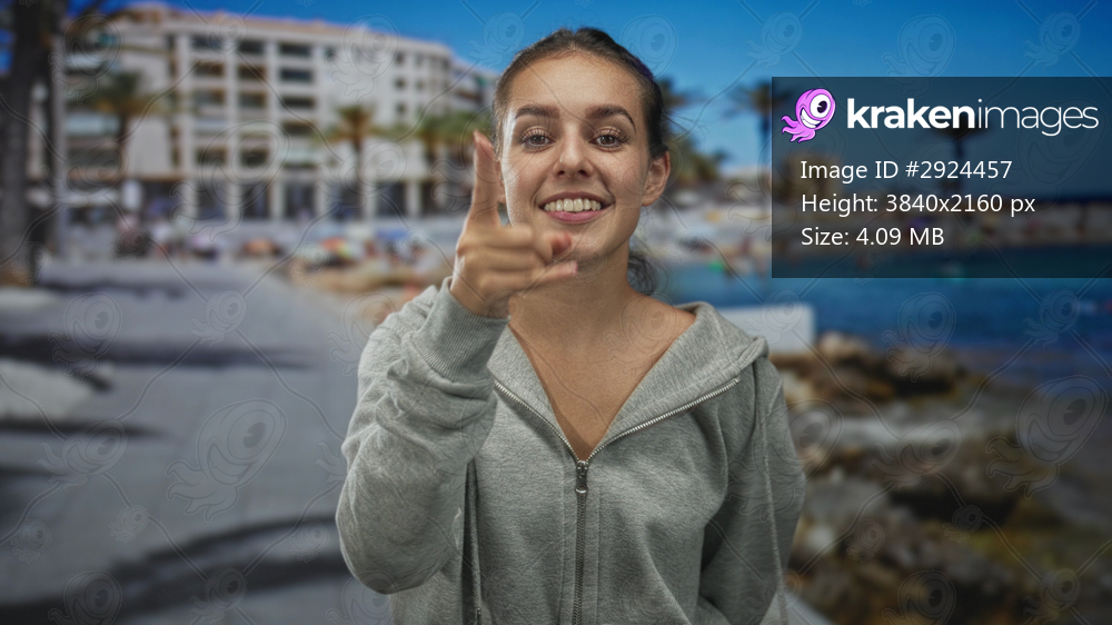 Young woman points finger to camera on a seaside street promenade and holds ok hand sign with both hands; cheerful friendly approval.