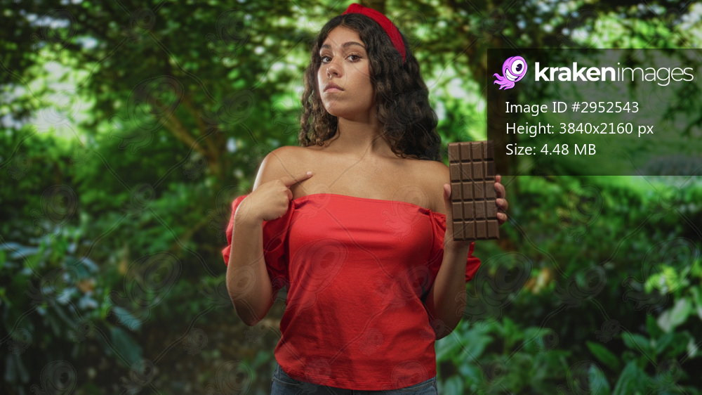 Young woman points finger to chest and bare shoulder while holding a large chocolate bar in a forest, wearing red off shoulder top and headband; confidence temptation. - Kraken Images