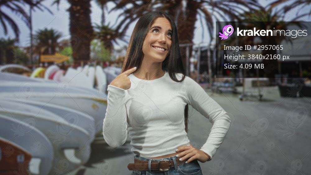 Young woman points finger to chest with surfboards and palm trees on a street; self belief confident.