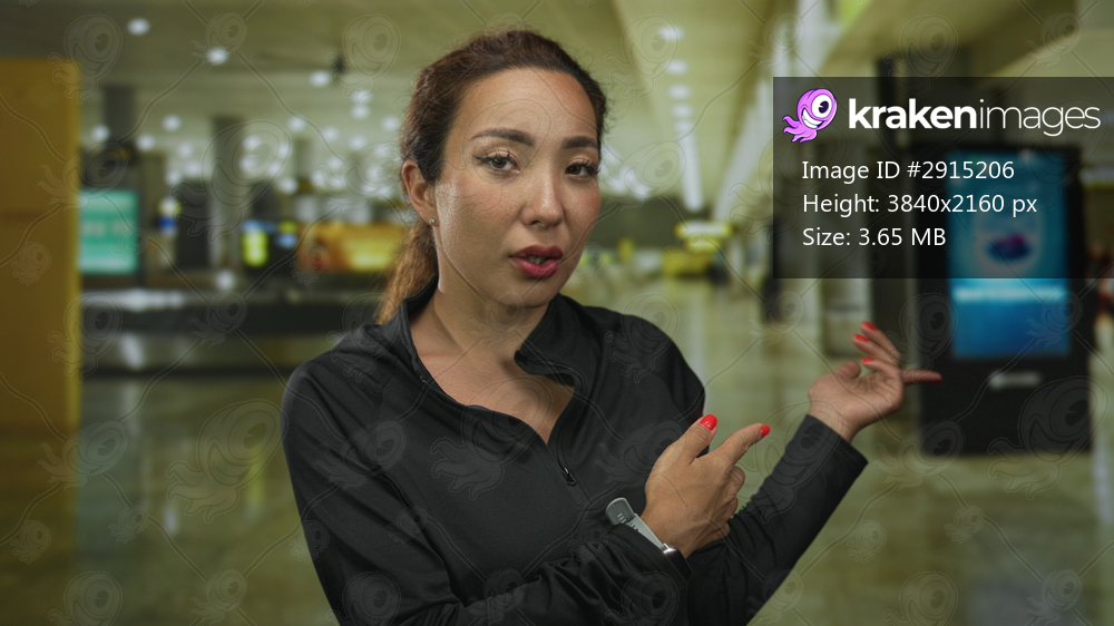 Young woman points finger to nearby digital kiosk at airport terminal while presenting information with an open hand; confidence guidance.