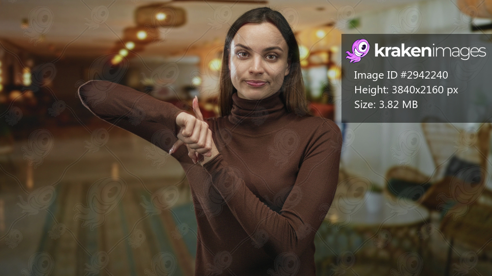 Young woman points finger to wrist in hotel building lobby wearing brown turtleneck with unimpressed face; impatience.
