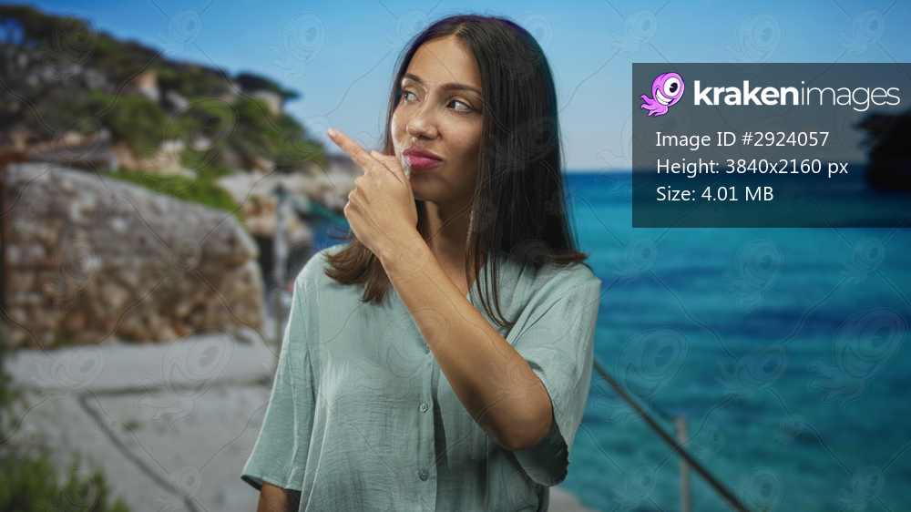 Young woman points finger toward the sea on a beach walkway with eyes closed and relaxed expression; confidence.