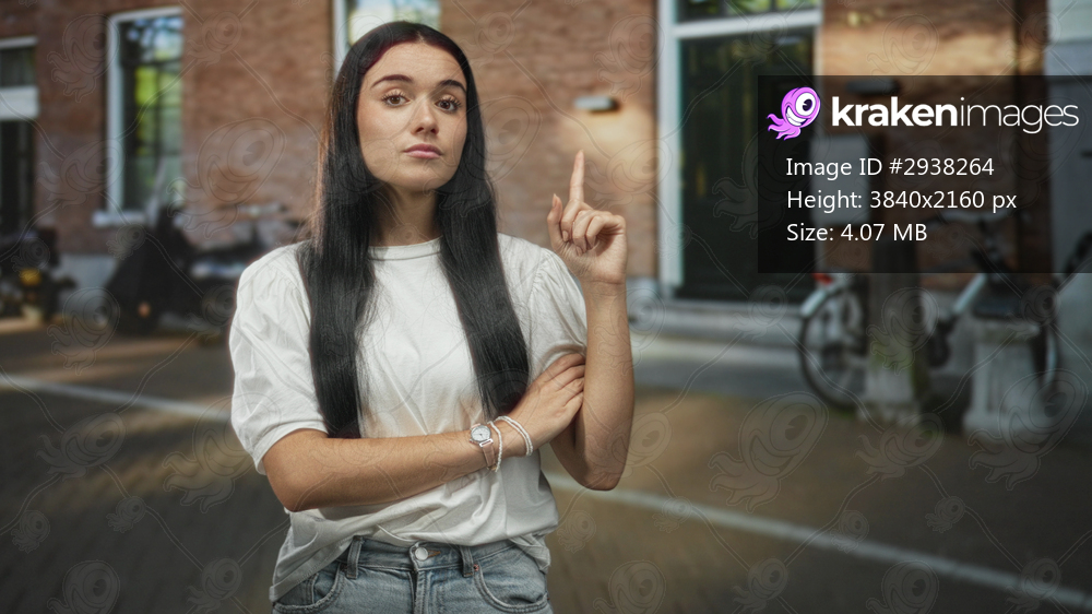 Young woman points finger upward with crossed arms showing wristwatch and bracelets on a street with brick doorways and bicycles; curiosity decision.