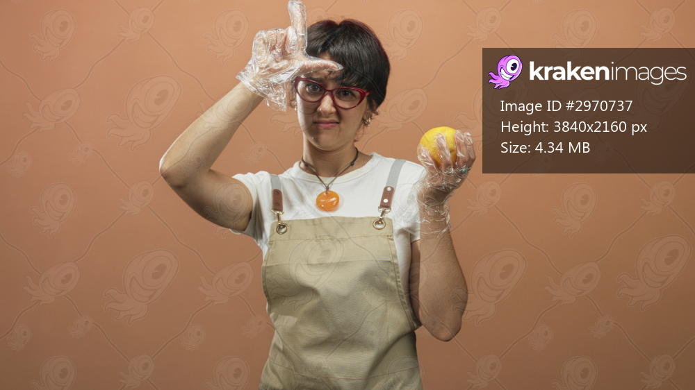 Young woman points finger upward and holds an orange while wearing gloves and an apron in a studio; skepticism caution.