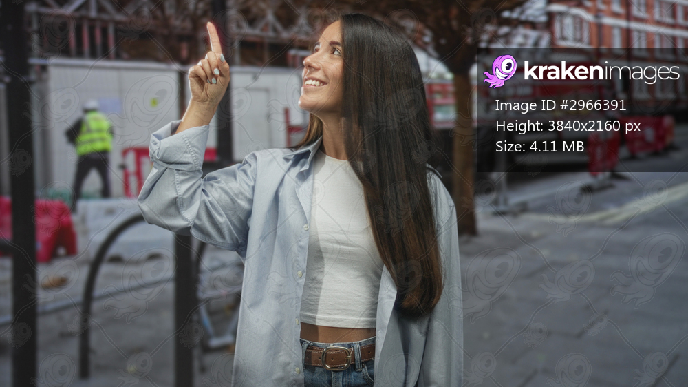 Young woman points finger upward on a city street near construction barriers, smiling and showing bare midriff and casual jeans outfit; optimism discovery. - Kraken Images