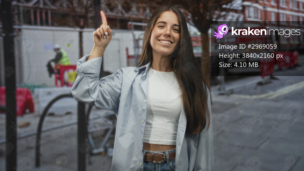 Young woman points finger upward on a city street near construction barriers, smiling and showing bare midriff and casual jeans outfit; optimism discovery. - Kraken Images