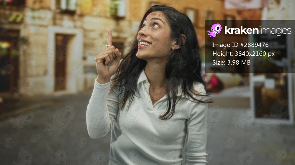 Young woman points finger upward on a cobblestone street with mouth open and animated expression near a parked car and building facade; idea discovery surprise. - Kraken Images
