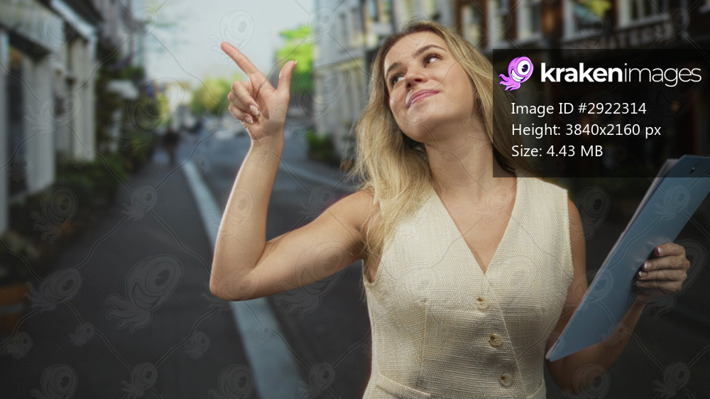 Young woman points finger upward on street while holding clipboard and smiling; confidence leadership assertiveness.