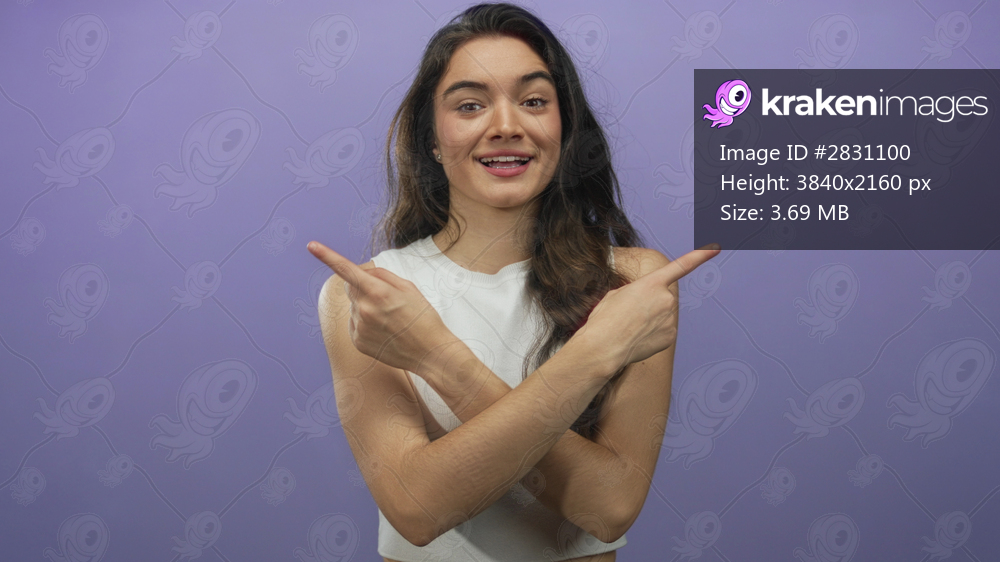 Young woman points fingers and shows bare arms and white crop top in studio shot with purple background; happiness.