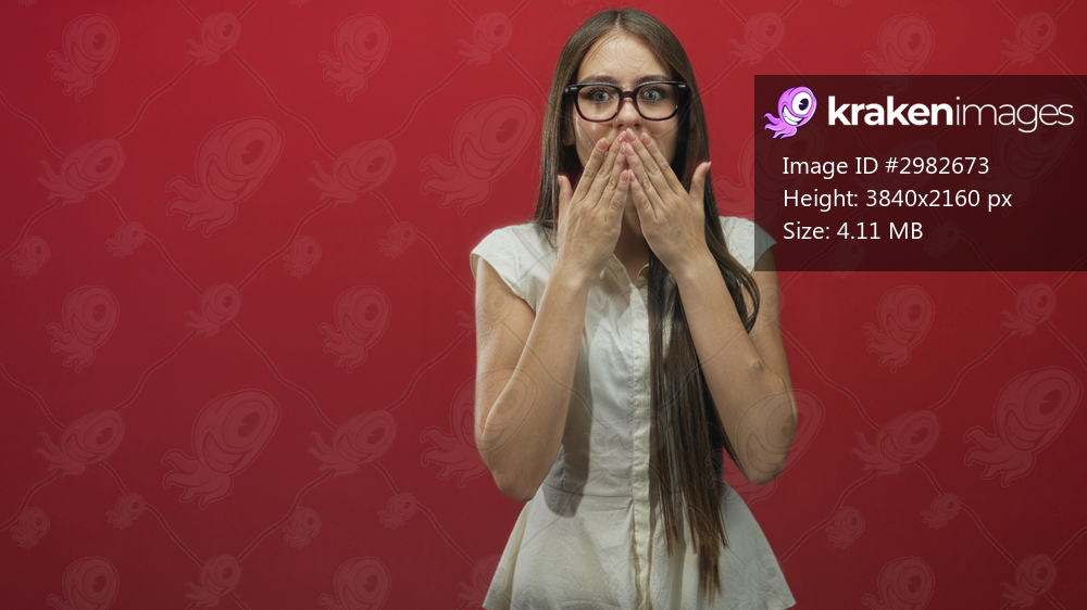 Young woman points fingers toward camera with hands visible in a red studio, surprised open mouth gesture; playful affection.