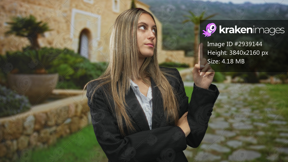 Young woman points index finger upward in villa courtyard building near stone pathway and potted plants, crossed arms, business jacket; confidence.