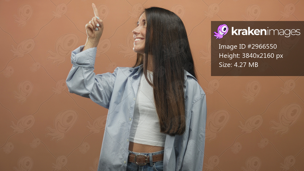Young woman points index finger upward with smile and visible hand, wearing blue buttonup shirt and jeans in studio; confidence idea.