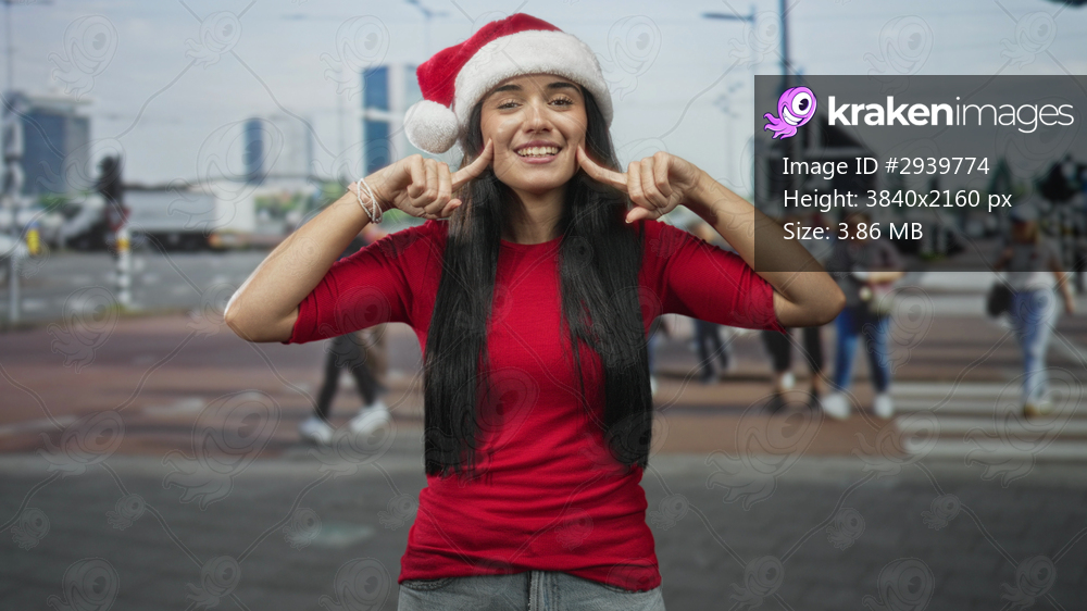 Young woman points index fingers to cheeks and smiles in a busy city street crosswalk wearing santa hat and red shirt, long hair visible; holiday joy.