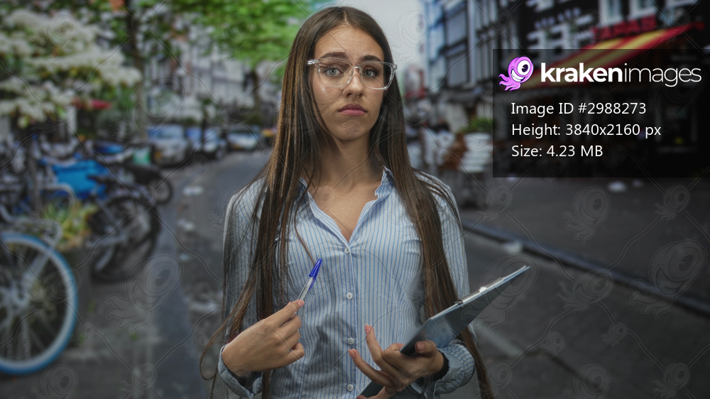 Young woman points pen while holding clipboard outside a cafe on a busy street lined with bicycles and cobblestones; confusion inquiry.