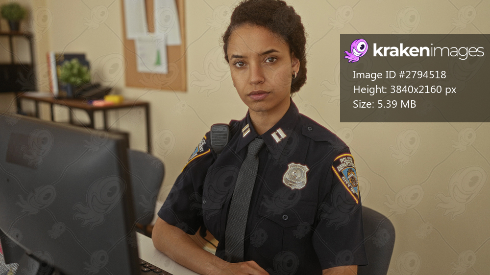 Young woman police officer holds palms forward in a calm gesture at station desk; calm professionalism.