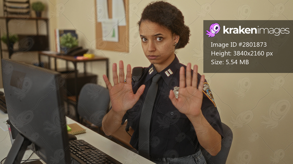 Young woman police officer holds palms forward in a calm gesture at station desk; calm professionalism.