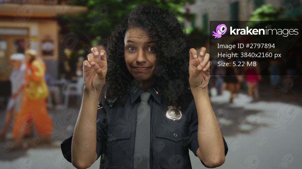 Young woman police officer makes air quotes with raised hands on a bustling street in broad daylight; skepticism.