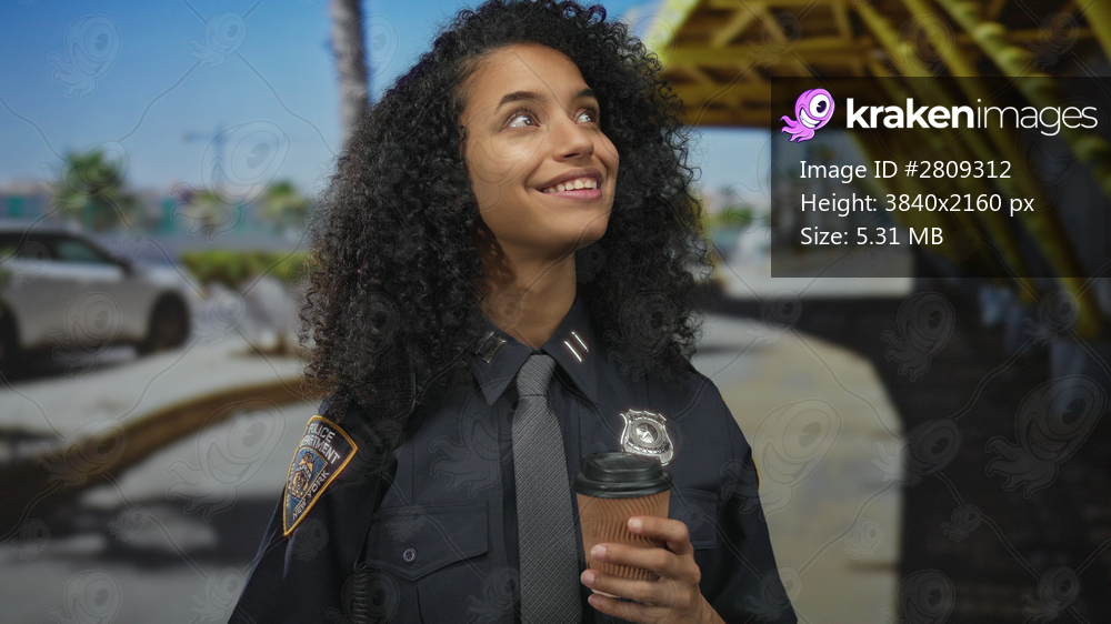 Young woman police officer smiling outdoors holding coffee on street in uniform