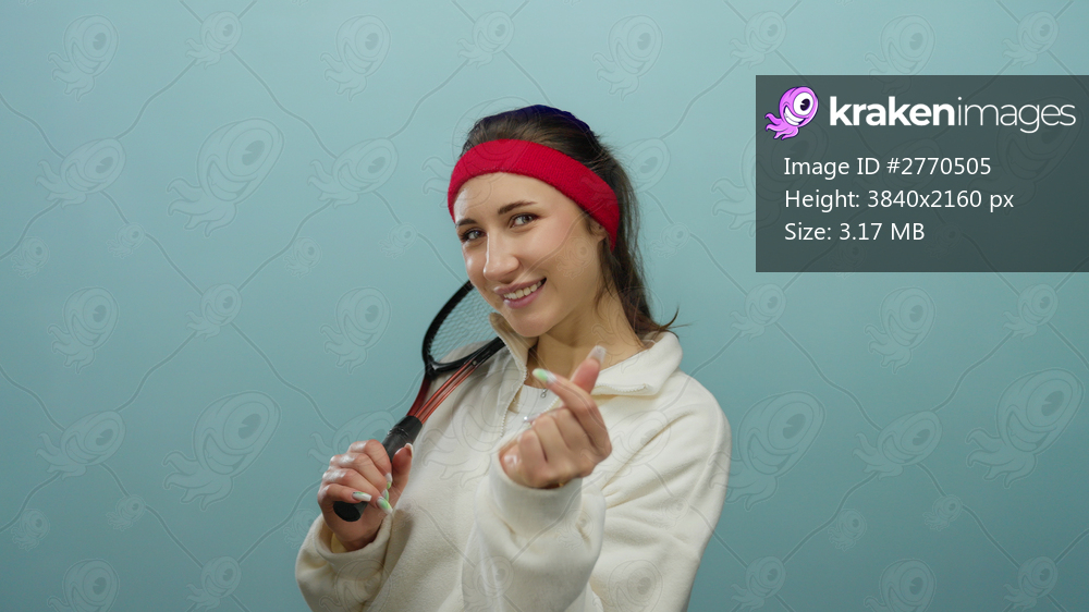 Young woman poses confidently holding a tennis racket while making a finger heart gesture against an isolated blue background, highlighting her sporty and cheerful demeanor. - Kraken Images