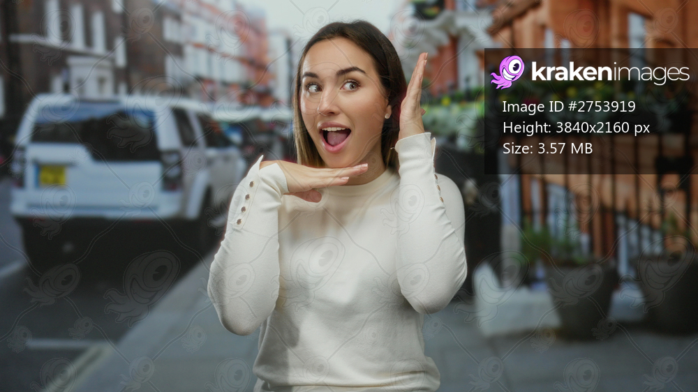 Young woman posing on an outdoor street with a white car in the background, vibrant urban setting and charming demeanor.