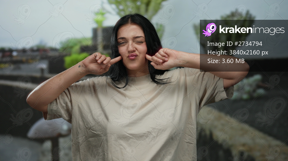 Young woman posing playfully on a city street with lush outdoor greenery and a cheerful expression captured in an urban setting during the day.