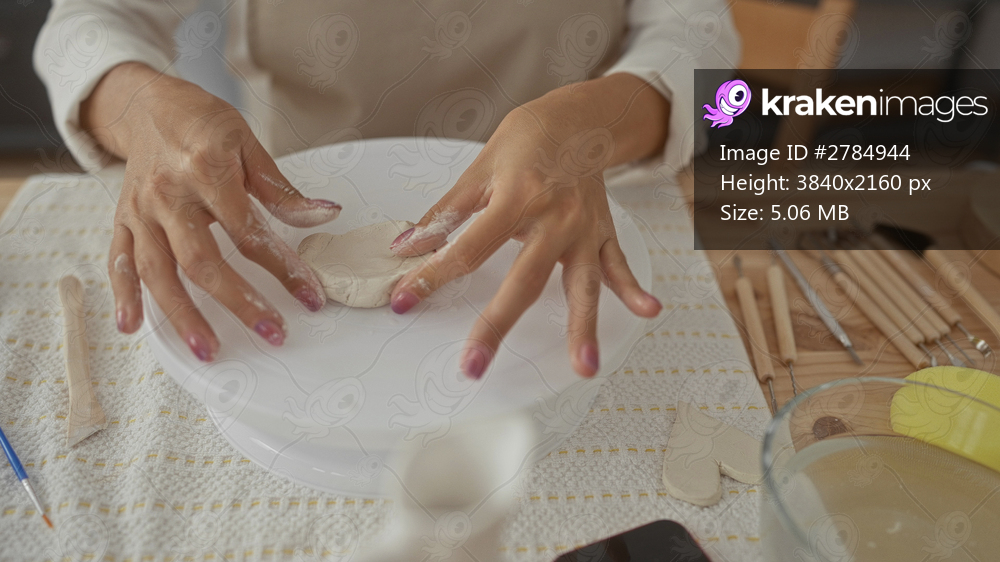 Young woman potter shapes slab of clay with bare hands on pottery wheel in studio; craft creativity patience.