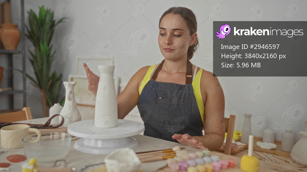 Young woman potter shaping a ceramic vase with hands at a pottery turntable in studio; creative focus.
