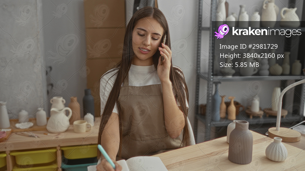 Young woman potter wearing apron holds phone to ear and writes with hand in notebook at a pottery studio surrounded by vases and shelves; contemplation planning. - Kraken Images