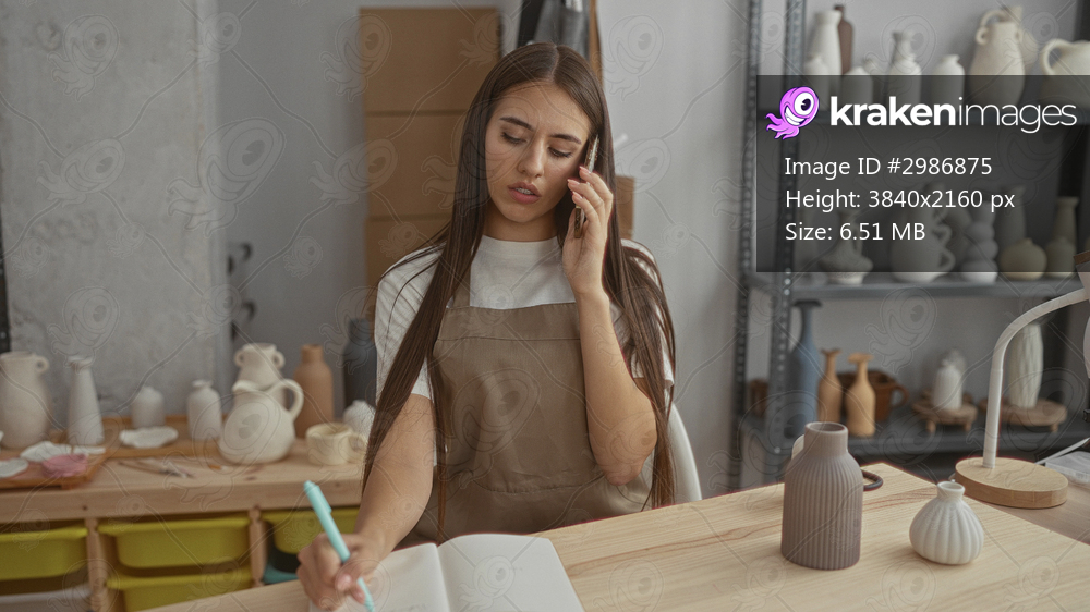 Young woman potter wearing apron holds phone to ear and writes with hand in notebook at a pottery studio surrounded by vases and shelves; contemplation planning. - Kraken Images