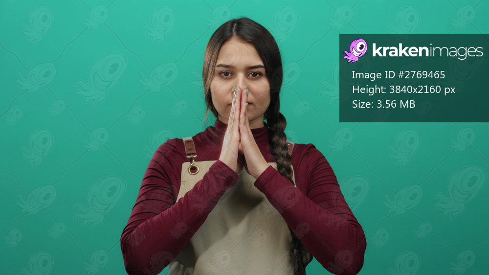 Young woman praying with closed eyes wearing apron against isolated green background suggests peaceful waitress or worker moment of reflection and spirituality. - Kraken Images