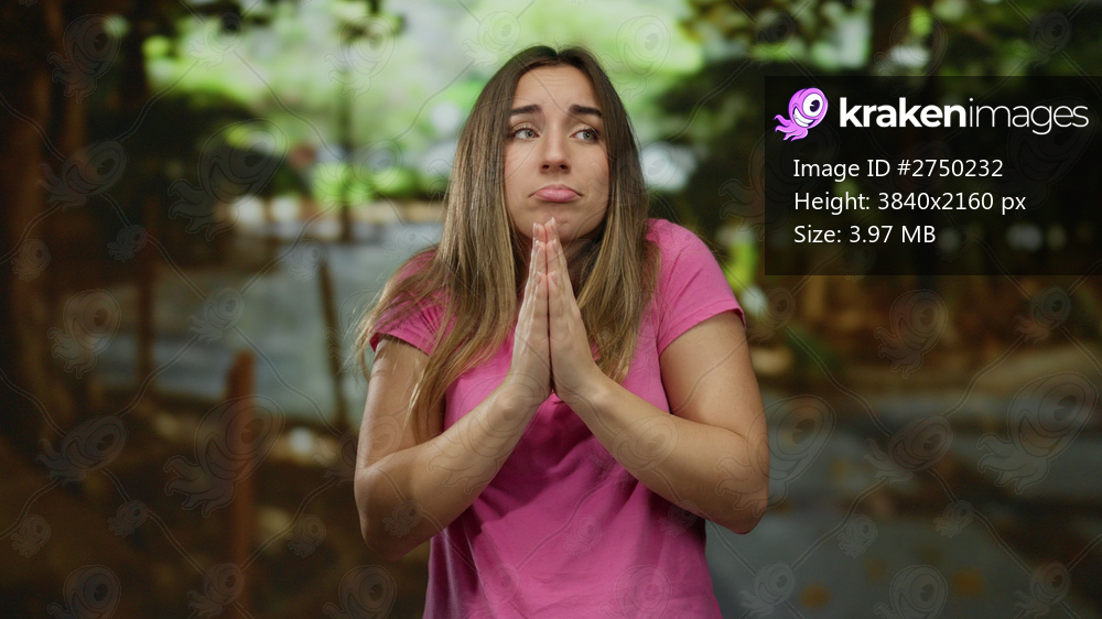 Young woman praying with hope in peaceful outdoor park background, wearing pink shirt, expressing emotion, standing in nature, serene and contemplative atmosphere. - Kraken Images