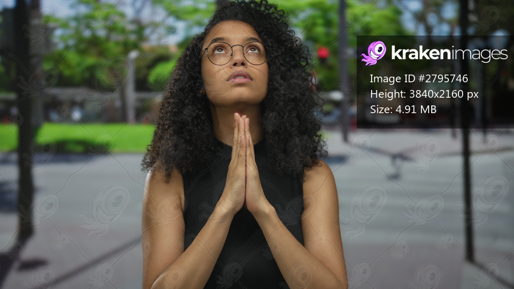 Young woman praying outdoors on a city street with blurred green background, eyes closed, hands together, expressing peace and tranquility, wearing black sleeveless top and glasses. - Kraken Images