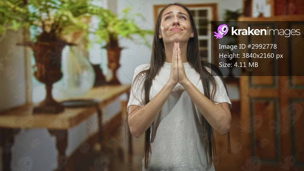 Young woman praying with palms pressed together and closed eyes, wearing white tshirt, standing near wooden cabinet and large decorative vase in a building interior; serenity. - Kraken Images